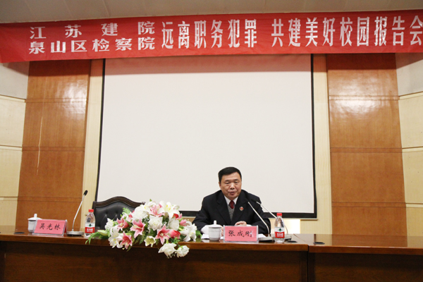 徐州市泉山区人民检察院党组书记张成刚检察长受邀作了题为“远离职务犯罪,共建美好校园”的专题报告。张检察长从职务犯罪的现状和发案特点、职务犯罪的原因和如何预防职务犯罪三个方面作了一场精彩的辅导报告。张检察长结合多年的检察工作实践,运用易发职务犯罪的典型案件,准确描述了什么是职务犯罪,并从职务犯罪的类型、方式、手段等几个方面,全面分析了职务犯罪的心理风险,针对职务犯罪发生的原因,指出了具体的防范方法和措施,提出党员干部要“定一条底线、添一些怕性、多一些忧虑”。张检察长的报告为我们准确全面理解什么是职务犯罪,如何有效防范职务犯罪,提供了重要的帮助。