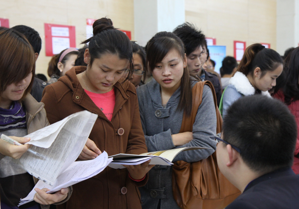 毕业生们兴致勃勃地向招聘单位咨询用人情况,招聘人员耐心解答。