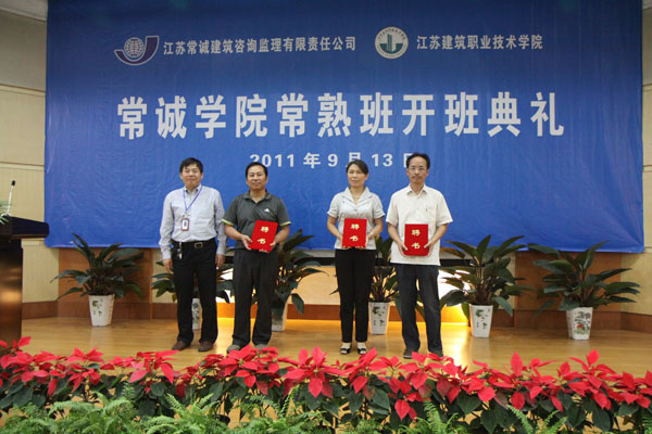 9月13日下午,江苏常诚建筑咨询监理有限公司与我校校企合作共建的“常诚学院—常熟班”开班典礼隆重举行,常诚集团副总经理孔德新、副总工程师付玉珍、办公室主任陈文忠一行,副院长张登宏、校企合作办、招生就业办、学工处等部门负责人,相关学院负责人以及常熟班全体同学参加了本次开班典礼。典礼由校企合作办公室主任许能生主持。