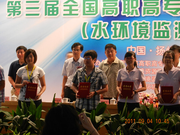 9月4日,第三届全国高职高专环保类专业技能大赛在扬州圆满落幕。我校市政学院代表队(指导教师:刘春梅、黄晓菊)在比赛中荣获团体二等奖,其中,环测09-3班的宗文瑶同学在化学分析单项比赛中荣获一等奖,仪器分析单项比赛中荣获二等奖,全能比赛中荣获一等奖;环测09-2班李幸蔚同学在化学分析单项比赛中荣获二等奖,仪器分析单项比赛中荣获三等奖,全能比赛中荣获三等奖;环测09-3班的李敏同学在化学分析单项比赛中荣获三等奖,仪器分析单项比赛中荣获三等奖,全能比赛中荣获三等奖。