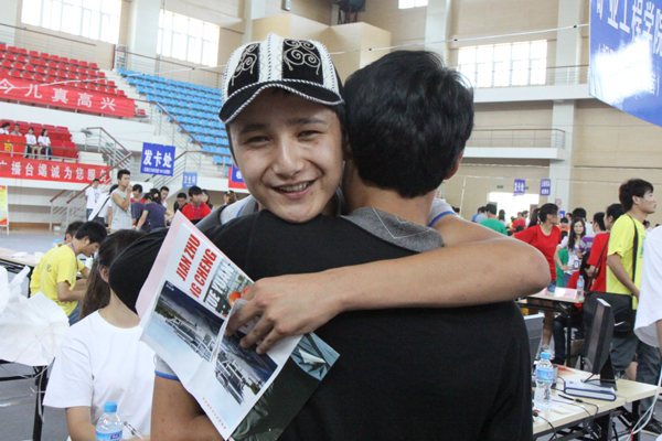 去年我校招收了新疆、玉树地区的49名学生,通过外地一年的语言学习,今天正式来校学习。吾尔开西·叶尔肯塔依与阿力木江·伊马木艾散男见面格外亲切。