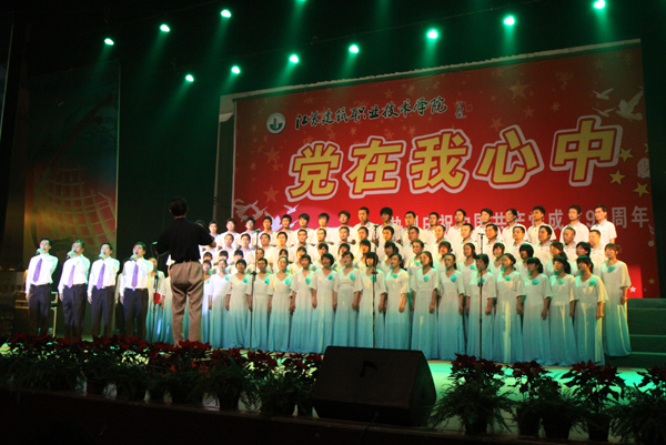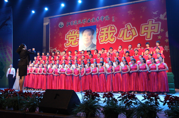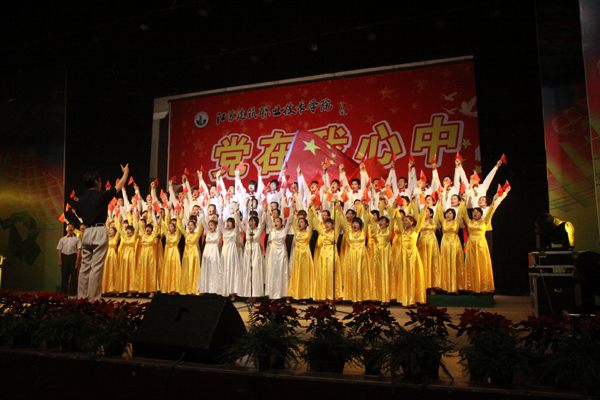 6月14日,在中国共产党成立90周年之际,我校在会堂隆重举行了“党在我心中”红歌合唱比赛,全校17个代表队共1300余名师生参加了比赛。校领导王旭善、袁洪志、吴光林、季翔、任留钦、张登宏观看了比赛。市委宣传部、市教育工委、团市委、兄弟院校等单位的领导和专家担任评委。