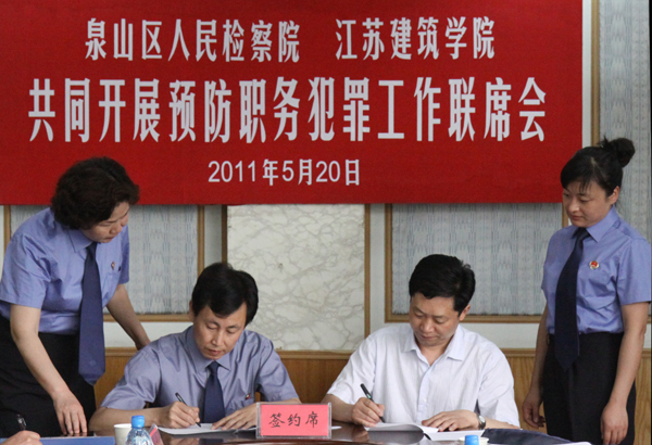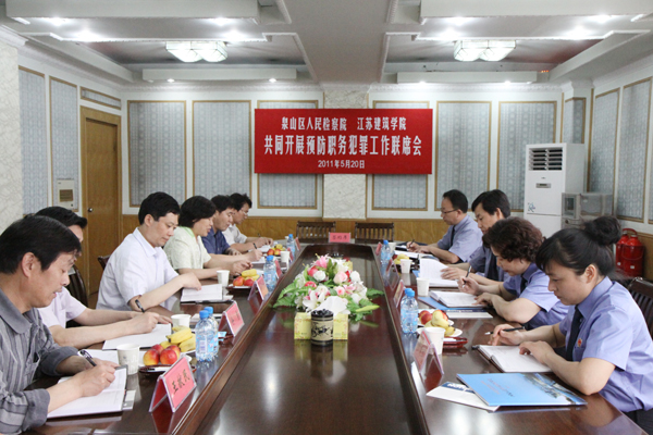 为深入贯彻落实江苏省教育厅、江苏省人民检察院《关于在全省高校和检察院开展预防高校职务犯罪共建活动的通知》要求,推动检校交流与合作,加强我校与检察院在预防职务犯罪工作方面的联系,5月20日上午,学校组织召开校检共建预防职务犯罪工作联席会。徐州市泉山区人民检察院邢洁副检察长一行四人应邀出席会议。我校党委副书记、纪委书记吴光林和全体纪委委员参加会议,纪委副书记、监察处处长周红霞主持会议。