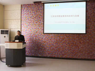 1月24日,江苏省教育厅高教处处长徐子敏来我校调研。汇报会在实训楼会议室召开,院长袁洪志向徐子敏处长汇报了我校国家示范建设项目进展情况。党委副书记吴光林,副院长季翔、张登宏以及相关职能部门负责人、示范建设项目负责人参加了汇报会。