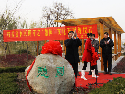 “憩园”文化石揭幕仪式拉开了庆祝校报创刊十周年的序幕。校报编辑部策划的“感恩十年,一路有你”校报文化系列活动还包括校友征文大赛、出版校报文学作品精选集、出版校报十年纪念特刊、承办江苏省高校校报研究会2010年年会、举办“短信达人”原创短信大赛以及师生书画展等。