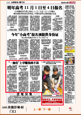 10月21日的《彭城晚报》A06版以《“一加壹”上学赚钱两不误》为题对我校经管学院大学生创业志愿服务活动进行报道。“一加壹”创业志愿服务活动在我校大学生创业氛围的影响下,开展了一个人加壹份钱,实现学生自主创业,志愿服务回报社会的活动。