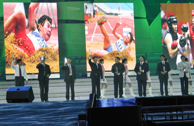 10月18日晚,江苏省第十七届运动会闭幕式在常州奥体中心体育馆隆重举行,我校体育代表团以总分430分获得高校部乙组团体总分暨“校长杯”奖第一名。袁洪志院长代表学校上台领奖,体育部负责人及全体教练员参加了闭幕式及颁奖晚会。