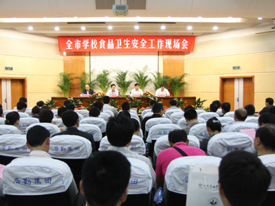 为进一步加强徐州市学校食品卫生安全的监督和管理,6月4日上午,徐州市学校食品卫生安全工作现场会在我校学术报告厅召开,我校院长袁洪志出席会议并致辞,徐州市人民政府副秘书长刘宏、徐州市教育局局长强国分别讲话,会议由徐州市卫生局副局长苗斌主持。全市各县区卫生、教育部门负责人以及各类学校饮食工作分管领导、幼儿园园长及食堂负责人一百五十余人参加了会议。