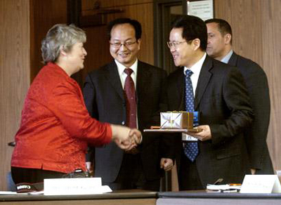 据美国《Gazette时报》报道,Linn-Benton社区学院院长Rita Cavin(左),在星期一举行的《中国高职院校领导海外培训项目》欢迎仪式上,向徐州建筑职业技术学院院长袁洪志(右)赠送礼品,出席仪式的还有郑小勇(中)以及Bill Thallemer。来自中国的六位代表正在对Linn Benton社区学院进行为期两周的访问,期间他们将在Linn Benton社区学院学习院校管理、师资培养、专业发展以及与企业、社区的联系合作等内容。Linn-Benton社区学院是由美国社区学院学会与中国教育国际交流协会组织的高职院校领导海外培训项目在全美国遴选的8所院校之一。