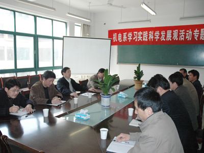 为了更好地推动我院学习实践科学发展观活动顺利开展,深入了解基层系部学习实践活动进展情况,3月18日下午,院学习实践活动领导小组组长、党委书记王旭善,活动领导小组办公室成员沈士德、方桐清、孙世奎、胡永等深入建艺系、机电系进行学习实践科学发展观调研活动。