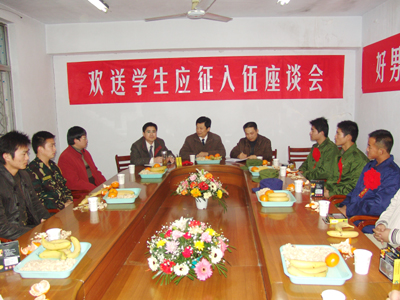 2008年,我院有八名在校大学生被批准应征入伍。12月9日下午,院党委副书记吴光林、学工处处长曾凡远以及院团委、相关系(院)和学生会有关同志、退伍返校大学生在学生处公寓会议室为入伍的八名同学举办欢送会。