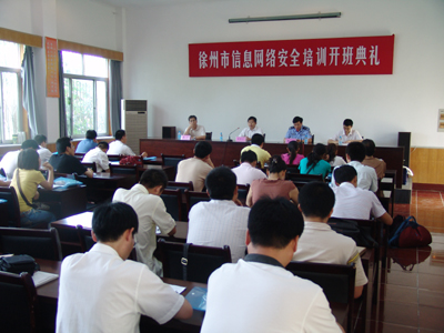 7月7日,徐州市信息网络安全技术培训工作举行了开班典礼,徐州市公安局网络警察支队副支队长季涛、徐州市电化教育馆馆长周岩、我院张登宏副院长参加了典礼并讲话。本次培训对象是市教育局所属各单位的网络管理员,共约400余人,首期培训班计划培训55人,其余人员的培训将在新学期分期进行。培训工作由电子信息工程系承担,根据培训工作的需要,电信系组织教师重新安装了该系实训机房的软件,精心挑选任课教师及实训指导教师,指派一名教师担任班主任。培训教室使用电信系多媒体软件机房,一人一机,培训采用边讲边练学做合一方式进行。培训工作开展之前,市公安局、市电化教育馆等有关领导对电信系师资情况、机房软硬件条件、后勤保障等工作进行了实地考察。