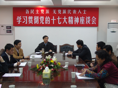 11月15日,我院民主党派、无党派人士学习贯彻党的十七大精神座谈会在院第一会议室召开。院党委书记王旭善、各民主党派以及无党派人士代表出席了座谈会,院党委组织部部长、统战部部长徐勇主持了座谈会。