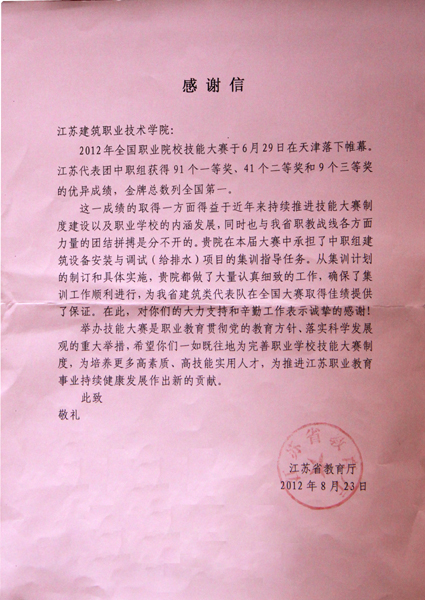 近日,江苏省教育厅给我校寄来感谢信。信中提到,江苏代表团中职组在2012年全国职业院校技能大赛中取得佳绩,成绩的取得离不开我校在本届大赛中给予中职组建筑设备安装与调试(给排水)项目的集训指导,为集训开展做了大量认真细致的工作,为江苏省建筑类代表队在全国大赛中取得优异成绩提供了保证。对此,江苏省教育厅对我校的大力支持和辛勤工作表示诚挚的感谢!同时也希望我校能够继续完善职业学校技能大赛制度,为培养更多高素质技能型人才,为推进江苏职业教育持续健康发展作出新的贡献。