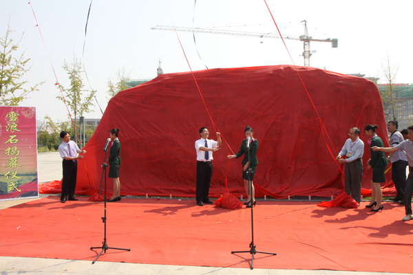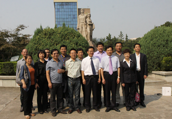 校领导与部分校友在东校区雕塑前合影留念
