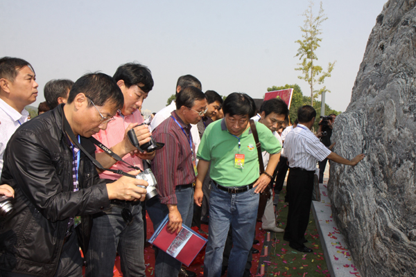 校友在文化石前拍照留念