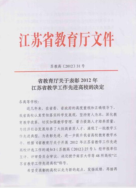 根据省教育厅《关于表彰2012年江苏省教学工作先进高校的决定》(苏教高[2012]31号),我校获得2012年“省教学工作先进高校”荣誉称号。