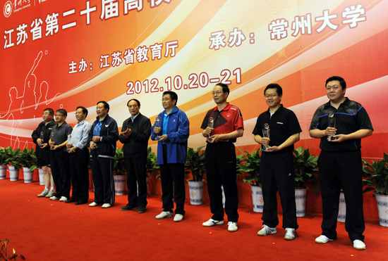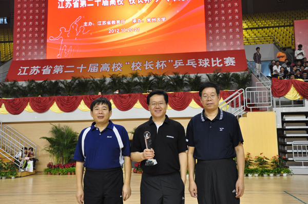 10月20至21日,江苏省高校第二十届 “校长杯”乒乓球赛在常州大学举行。54支队伍参加了乙组(高职高专组)比赛,我校代表队在党委书记袁洪志带领下,发扬奥林匹克精神,不畏强手,顽强拼搏,荣获第六名的好成绩。(工会)