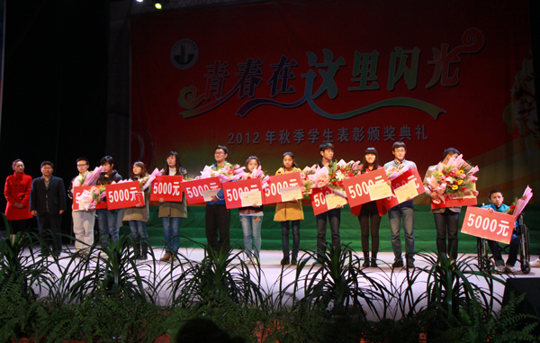 青春在这里闪光!2012年秋季优秀学生表彰颁奖典礼于11月6日在学校会堂隆重举行。副院长任留钦、沈士德及各相关职能部门负责人、各二级学院副书记出席了颁奖典礼并为受表彰的学生颁奖。全体专职辅导员、部分教师、学生代表1300余人参加了颁奖典礼。