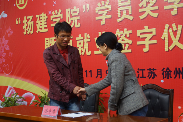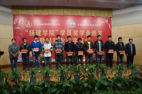 11月9日,扬建集团副总经理杨志娟等一行3人来我校为扬建学院优秀学员颁发奖学金,并与2011届42名学员签定预就业协议。沈士德副院长及相关职能部门负责人、部分二级学院领导参加了颁发仪式。