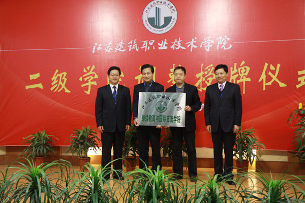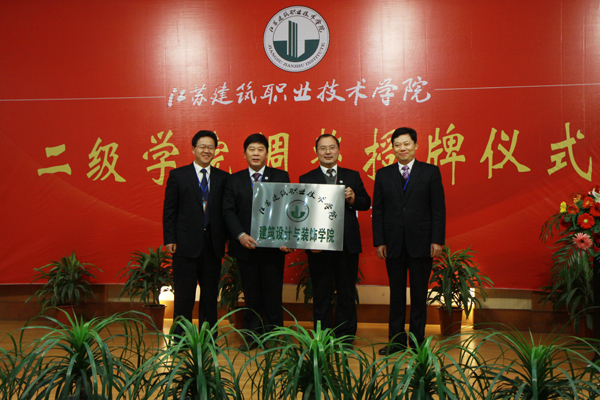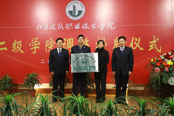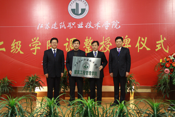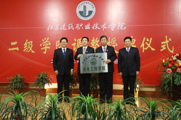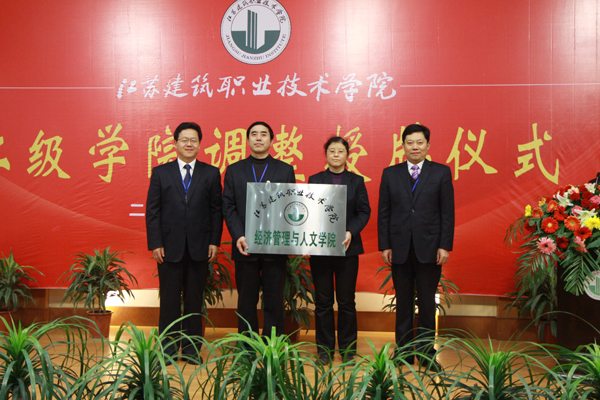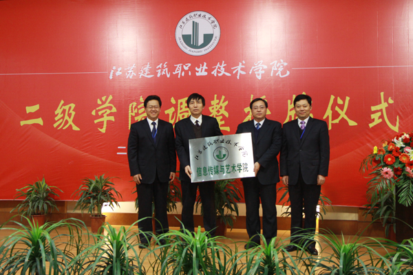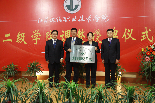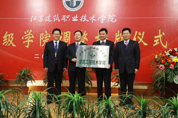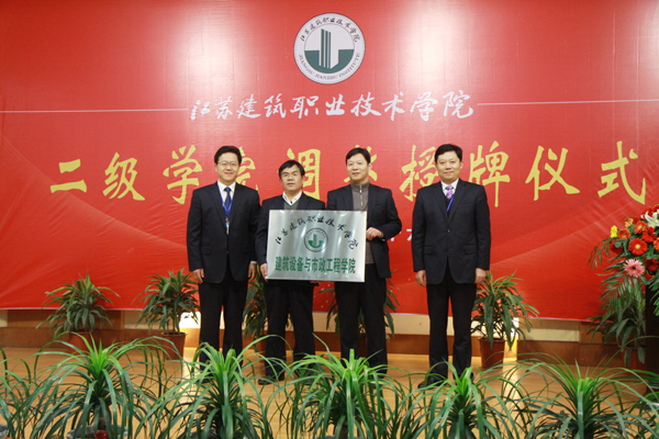 在欢快的音乐声中,党委书记袁洪志、院长吴光林先后为新成立的建筑工程技术学院、建筑设计与装饰学院、建筑设备与市政工程学院、建筑工程管理学院、矿业与交通工程学院、机电工程学院、经济管理与人文学院、信息传媒与艺术学院等8个二级学院、继续教育与国际交流学院、大学生素质教育中心的党政领导授牌。信息传媒与艺术学院院长胡瑞仲代表新组建的二级学院作了发言。