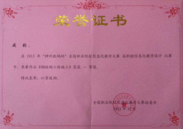 12月8日,由教育部职业教育与成人教育司、工业和信息化部人事教育司和江苏省教育厅主办的“2012全国职业院校信息化教学大赛”决赛在南京举行。 来自全国高职、中职院校的825名选手参加了“多媒体教学软件”、“信息化教学设计”、“网络课程”、“信息化实训教学”决赛,我校建工学院戚豹老师以“《钢结构工程施工》信息化教学设计”为选题参加了高职组“信息化教学设计”比赛,并荣获全国职业院校信息化教学大赛一等奖。