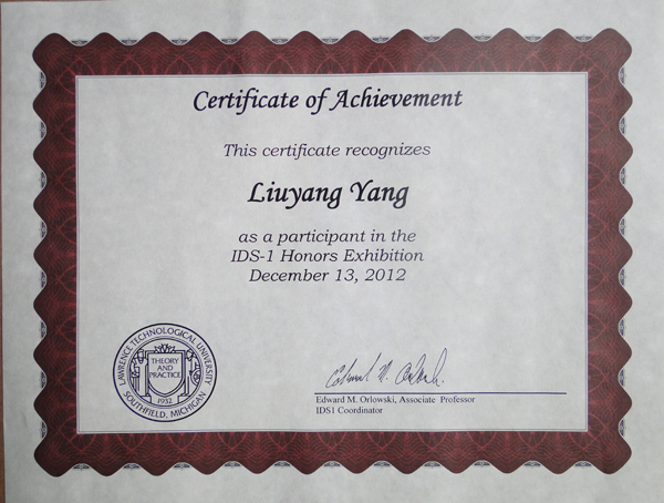 12月14日,来自美国劳伦斯科技大学的好消息。我校海本直通车项目首批出国的学生杨留洋(原建筑设计学院建设09-4班学生,2012年8月出国),在劳伦斯科技大学的第一学期专业学习结束后,荣获建筑设计专业《综合设计》(IDS:Integrated Design Studio)课程项目优秀学生的称号,获得该殊荣的还有另外一名美国学生。该课程设计项目为期八个周,成果为一系列设计图纸和若干个设计模型。杨留洋同学在迅速适应英语语言环境的同时,努力刻苦学习,善于钻研的精神,为我校海本项目的其他同学海外留学开了个好头,为后续的留学学生学习树立了好榜样。(基础部 王静)
