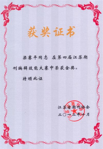 江苏省期刊协会于2012年10月20日在东南大学举办了第四届江苏期刊编辑技能大赛,全省期刊界近300名编辑参加了大赛,我校学报编辑部梁赛平同志在大赛中以总分第一获得本届技能大赛金奖。(学报编辑部:陶红林)