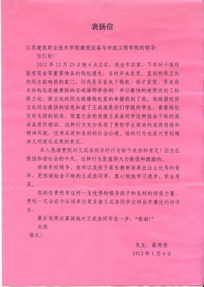 1月4日,建筑设备与市政工程学院领导收到一封校外失主来信,信中赞扬了水工11-1班王成浩在捡到其遗失的钱包后,想方设法积极寻找失主归还钱包的优秀事迹,充满了对学校及王成浩的感激之情。 王成浩同学拾金不昧的行为充分体现了我校学子高尚的道德品质和良好的精神风貌。现将该失主的感谢信全文转载如下,希望全校学生向他学习,将文明习惯养成教育内化为自身素质的提高,成为优秀的社会栋梁之材。(设备学院:刘爱萍)