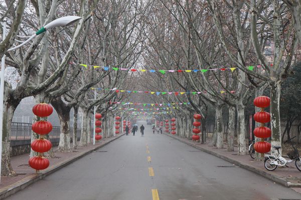 为迎接2013年新春佳节到来,校园主干道上挂满了彩旗和灯笼,使得假期冷清的校园格外“红火”,到处充满着祥和、喜庆的节日氛围。