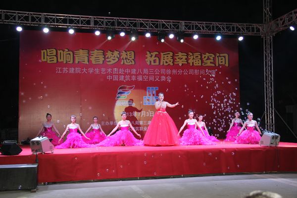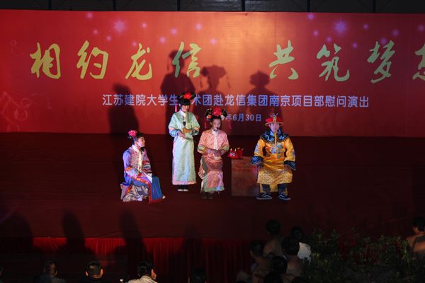 为了高质量完成本次慰问演出活动,大学生艺术团学生及指导老师进行了近一个月的精心排练。6月30日晚,慰问演出团首先来到龙信建设集团南京华润城项目工地,近千名建筑工人早已来到演出现场翘首期盼演出开始。在以“相约龙信,共筑梦想”为主题的近两个小时的演出中,现代舞、民族舞、街舞、民乐、现代乐、独唱、合唱、小品及现场互动等节目内容丰富,精彩纷呈,赢得了建筑工人的阵阵掌声和欢呼。艺术团大学生所迸发的青春活力和建设者的饱满热情,使现场气氛高潮迭起,热情激昂。