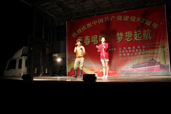 7月1日晚,慰问演出团来到美丽的江南古镇句容市白兔镇,我校师生受到了白兔镇党政领导的热情欢迎,句容市文化局、电视台领导也出席了演出活动。晚会以“青春唱响,梦想起航——庆祝建党92周年”为主题,为白兔镇群众奉献了一台体现艺术性、思想性和观赏性的演出,现场观众不时用手中的摄像机、照相机、手机等拍下精彩的瞬间,句容市电视台对演出活动进行了现场采访报道。