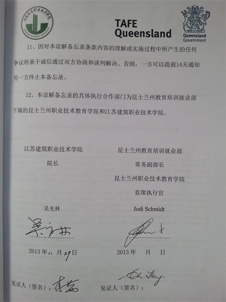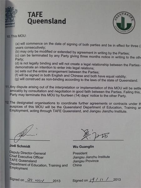 澳大利亚昆士兰州教育培训就业部与江苏省教育厅早在2005年就建立了全面友好合作关系,双方已成功举办了13届“江苏-昆州高等职业教育论坛”。目前,我校已与国(境)外23所高校建立友好合作关系,但与国外地方教育主管部门签署合作备忘录尚属首次。此次合作备忘录的签署,预示着我校可以与昆士兰州技术教育学院下属的13家TAFE学院开展多方交流与合作,进一步拓宽了我校国际交流与合作的途径。(外事办公室)
