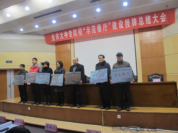 会议对徐州市13家高校(中专)餐饮服务食品安全“示范餐厅”进行了表彰,我校学生第一食堂、第三食堂获得 “示范餐厅”荣誉称号。泉山区、邳州市食品药品监管局、中国矿业大学及我校交流分享各自示范餐厅创建成功经验。