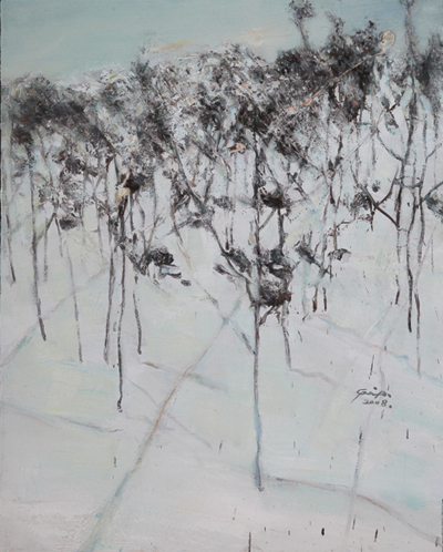 陈杰老师展出的油画作品题为《雪霁图-塔山写生系列34》,运用西方写实主义的绘画语言与中国传统文化精髓相结合,笔调扎实精深,短短的画笔却无期延伸了人们的视野,具有鲜活的生命力和强烈的冲击力。徐思田老师的中国画《当午》(180X90CM)在画法上既吸收传统的线描,又借鉴了西法元素,温暖的色彩,朴实厚重的造型画出了画家对自然生命美的发现和挚爱。