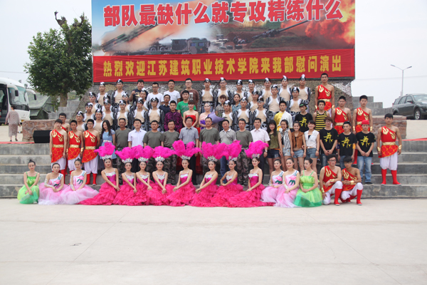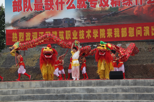 第十二集团军驻徐某部与我校建有良好的军地关系,一直承担着我校新生军训任务。为了表达对承训部队的感谢之情,校团委指导大学生艺术团对慰问演出节目进行了精心的编排。整台演出始终贯穿军地一家亲的主题,我校大学生龙狮队精彩纷呈的舞龙舞狮表演拉开了演出的序幕,优美动听的歌曲、曼妙轻盈的民族舞、热情奔放的现代舞和婉转悠扬的器乐演奏,展现了我校学生的青春风采。我校刚刚参加全省大学生艺术展演的男子群舞《鸿雁》把全场的气氛推向高潮,演出最后在《和谐大家庭》的歌声中圆满结束。