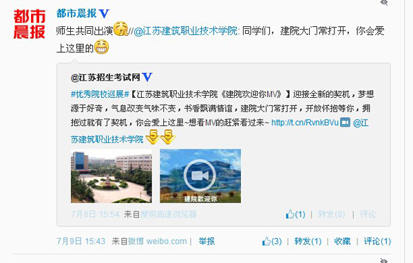 近日,由我校经管学院文秘专业学生陈岩作词,师生共同演出的MTV《建院欢迎你》在微博、微信朋友圈、QQ群等社交平台大量转发,被《都市晨报》、《江苏招生考试网》等媒体关注和转载,受到社会广泛好评。《建院欢迎你MTV》点击收看:http://www.iqiyi.com/w_19rsfdp3ll.html