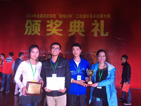 2014年全国高职院校“斯维尔杯”工程造价基本技能大赛于11月22日在广西南宁举行,本次大赛由全国高职高专教育土建类专业教学指导委员会工程管理类专业分委员会主办、广西建设职业技术学院承办。我校代表队经过激烈角逐,荣获五个专项中“工程造价创新思维”专项、“软件计算水电安装工程量”专项与“手工计算建筑与装饰工程量”专项等三个专项一等奖,“软件计算建筑与装饰工程量”专项二等奖,以团队总分第一名的成绩荣获团队一等奖,并荣获“优秀院校组织奖”。