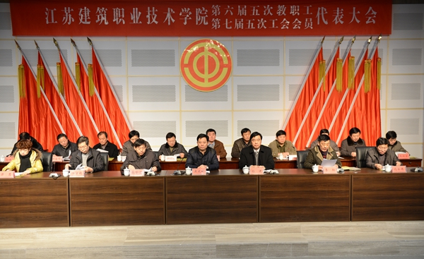 江苏建院六届五次教代会暨七届五次工代会1月28日在新图书馆报告厅召开,党委书记吴光林教授出席会议并讲话,院长孙进教授作2014年学校工作报告,全体校领导、正式代表、列席人员、特邀人员参加会议。