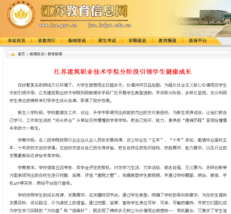 近日,江苏教育信息网以《华体会体育分阶段引领学生健康成长》为题,报道了我校在纷繁复杂的网络文化环境下,利用校友资源分阶段实施学生教育,引领学生健康成长的做法。