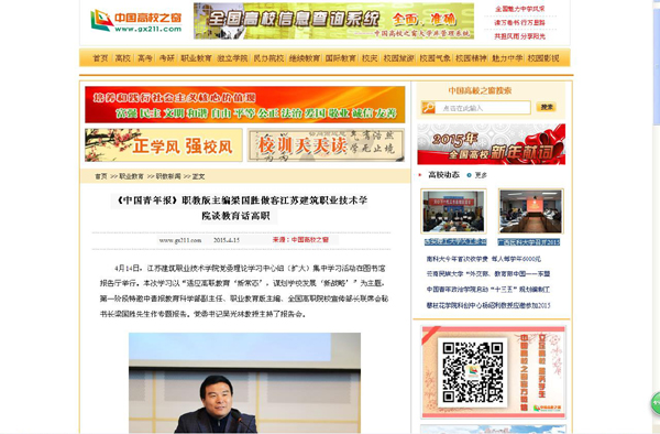 近日,我校特邀中青报教育科学部副主任、职业教育版主编、全国高职院校宣传部长联席会秘书长梁国胜先生作专题报告,该新闻在学校校园网主页发布以后,被中国高校之窗网全文转载,详见http://www.gx211.com/news/2015415/n8242252583.html。