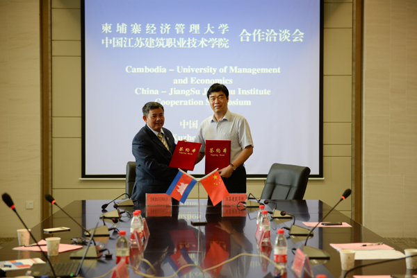 孙进院长代表学校向客人介绍了我校办学情况。通∙菲柯蒂校长介绍了柬埔寨经济管理大学的办学基本概况、八个校区布局及与中国高校开展国际交流合作情况。双方就选派柬埔寨学生到我校留学、加强两校经济管理类专业合作等议题深入交换了意见。通∙菲柯蒂校长表态,江苏经济社会发达,徐州地理位置优越,学校办学特色鲜明,回国后将积极推荐柬埔寨经济管理大学学生到我校留学。在愉快友好的交流氛围中,孙进院长与通∙菲柯蒂校长共同签署了《中国华体会体育与柬埔寨经济管理大学交流合作框架协议》。