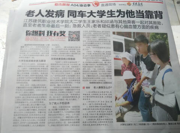 6月6日,我校市政13-1班王家乐、物流13-1班邱涵两位同学在公交车上积极救助发病老人,直至老者生命最后一刻,向社会传递了乐于助人的正能量,其事迹引起媒体关注。6月7日的《都市晨报》头版报道了其事迹,徐州夜新闻也将来校采访。