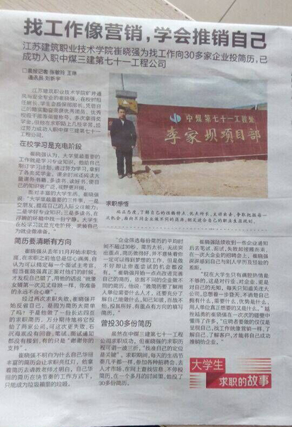 继6月26日、7月3日的《都市晨报》报道我校学生求职故事之后,近日该报再次以《找工作像营销,学会推销自己》为题,报道了我校矿井通风与安全专业学生崔晓强的求职故事。