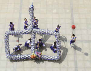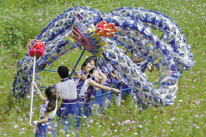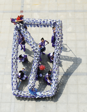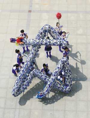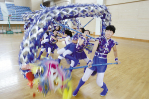 穿梭、蹲立、踩肩,一群身着蓝色服装的女孩子擎起一条长龙,按照规定套路进行训练,在闷热的体育馆中,连续的奔跑舞动让她们气喘吁吁,汗水顺着鬓角流下。这是江苏建筑学院的女子舞龙队,和男子舞龙队以及北狮队一起参加了8月初在我市举办的全国大学生舞龙舞狮锦标赛。