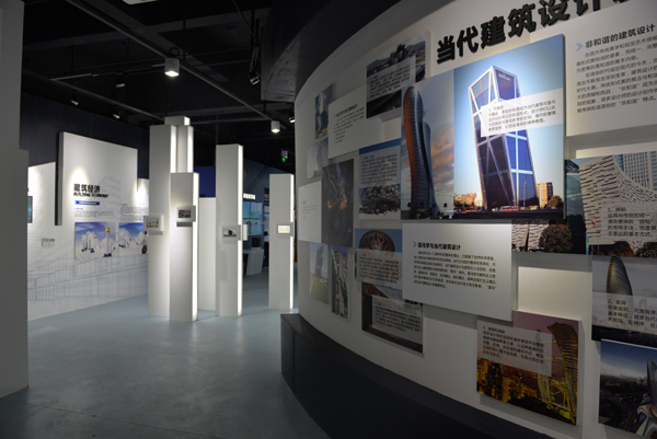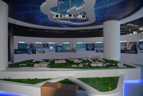 科技·智慧城市馆是学校党政于2012年在图书馆建设过程中即决定建设的一个文化育人场域,位于图书馆一层,总建筑面积约1300平方米。经过多轮讨论确定,该馆分三个部分:校史、校友文化分别占六分之一面积,“建筑·智慧城市”占三分之二面积,具有展示、查询、互动、实操等功能,运用了多种现代智慧技术,力求使学校所有专业都能在馆中得以体现,所有师生(包括校友)在其中都能找到自己的点。