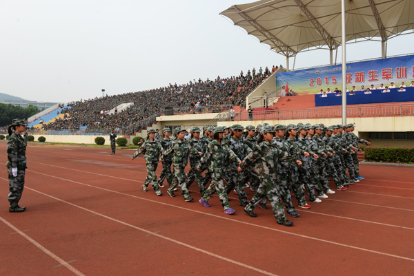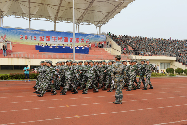 2015级新生经过两周的集中军训,顺利完成进入大学的第一课并接受检阅。在党委书记吴光林宣布汇报表演正式开始后,18支方队迈着整齐划一、刚劲有力的步伐,喊着铿锵响亮的口号走过主席台,接受领导和首长的检阅,展现了我校大学生高昂的斗志和良好的精神风貌。随后,2个会操排和1个军体操方队向在场的领导、老师和同学展示了军训成果。