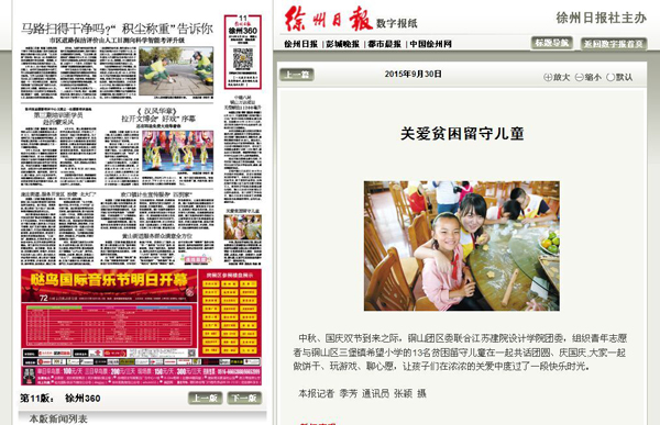 近日,我校设计学院团委组织青年志愿者与铜山区三堡镇希望小学的13名贫困留守儿童相伴快乐双节,《徐州日报》对此进行了报道。
