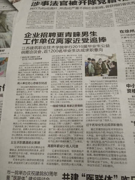 11月29日的《都市晨报》以《企业招聘更青睐男生,工作单位离家近受追捧》为题,报道了我校2016届毕业生公益供需洽谈会。