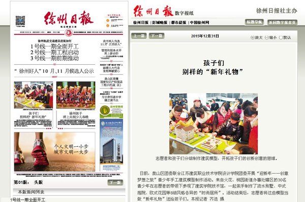 2015年12月31日,《徐州日报》在头版报道我校设计学院分团委志愿活动——孩子们别样的“新年礼物”。(设计学院 黄阳)
